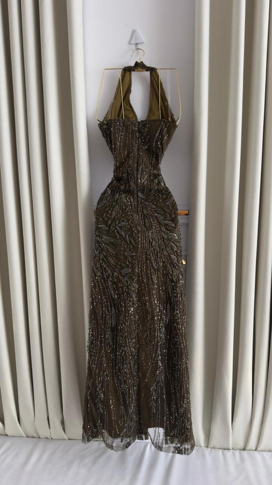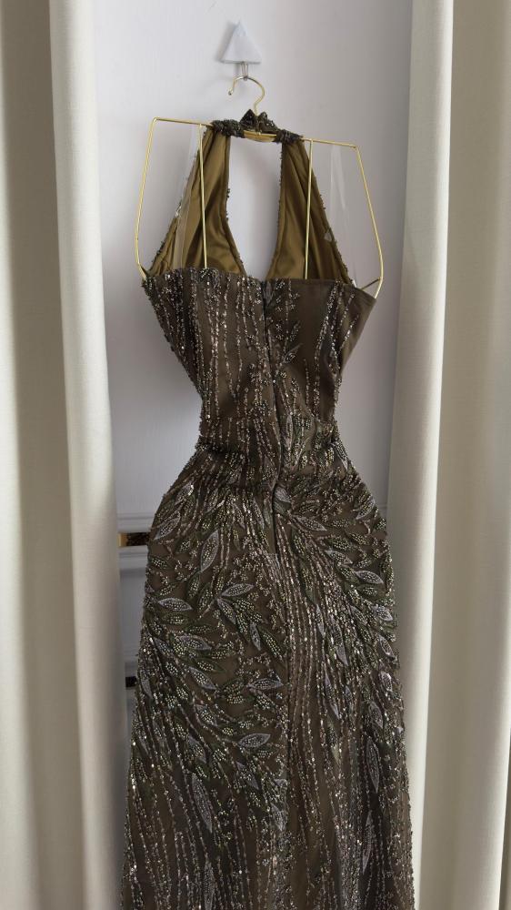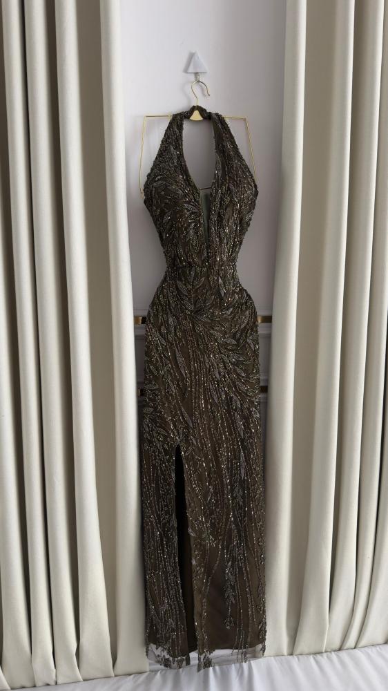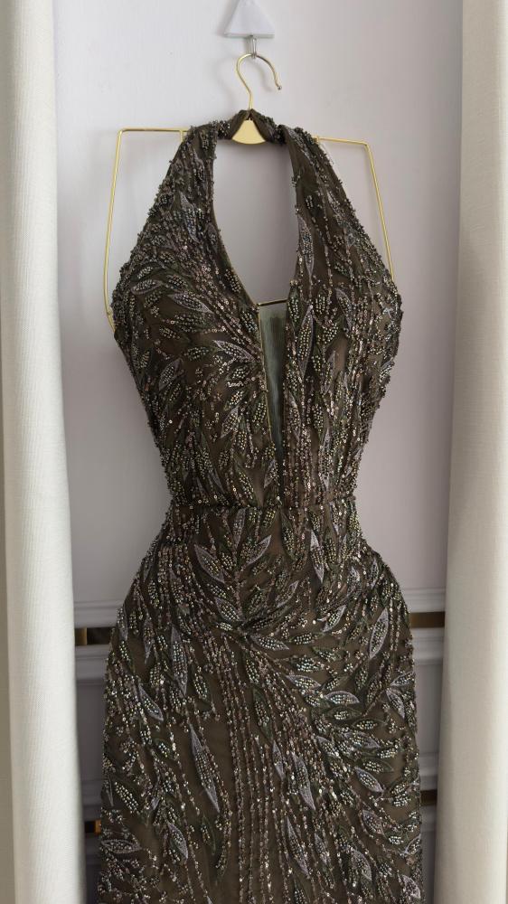 فستان سهرة أنيق بلون زيتي غامق يميل إلى البني الهادئ، مصمم من دانتيل فخم مطرز يدويًا بخيوط وخرز متداخل يعطي لمعة ناعمة راقية دون أي ترتر.