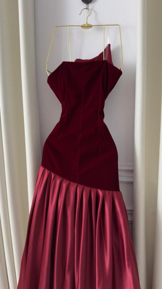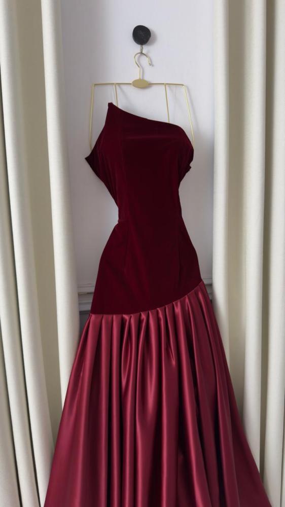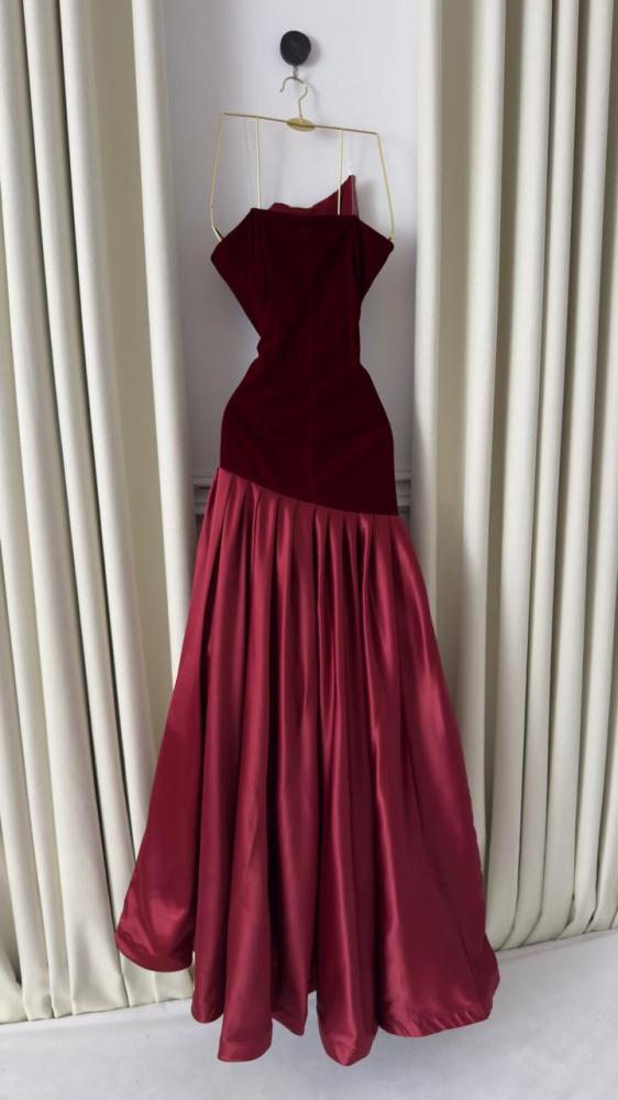 فستان سهرة راقٍ يجمع بين قماش المخمل الفاخر في الجزء العلوي والستان اللامع المنسدل في الأسفل بتصميم متقن يمنح إطلالة فخمة ولافتة.