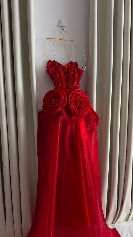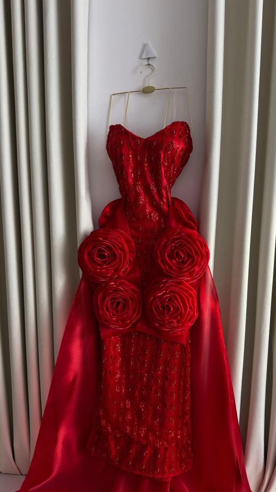 فستان سهرة آسر بلون أحمر لامع فاخر يجمع بين الجرأة والرقي في تصميم واحد يخطف الأنظار.