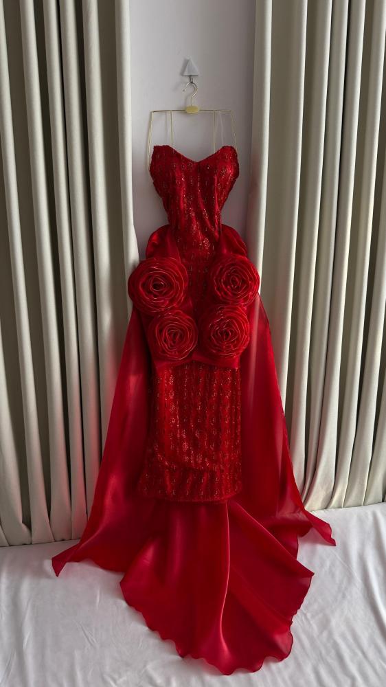 فستان سهرة أحمر مطرز بكلفة فاخرة مع جاكت اورجنزا بذيل منفصل