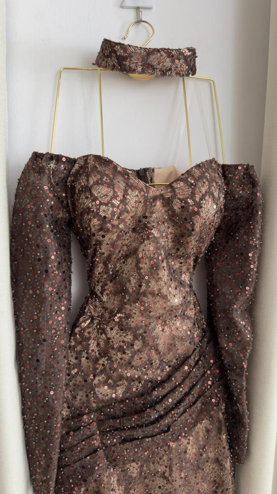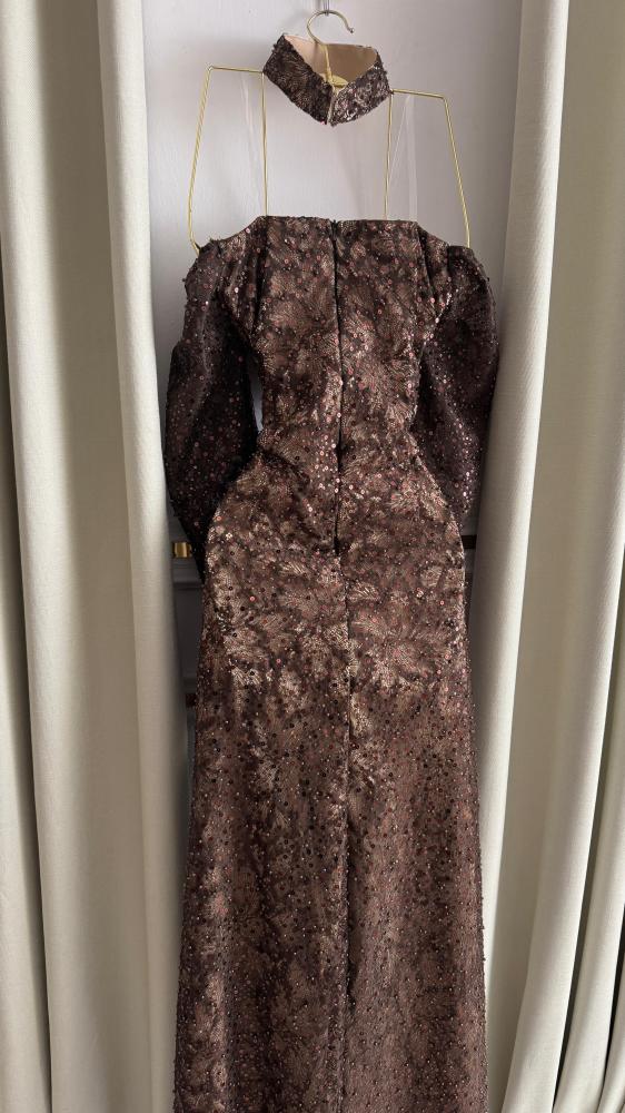 فستان سهرة جديد بلون بني شوكولاتة عميق بتفاصيل غاية في الفخامة.