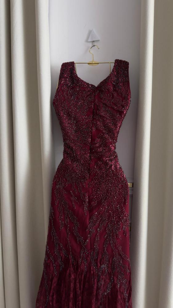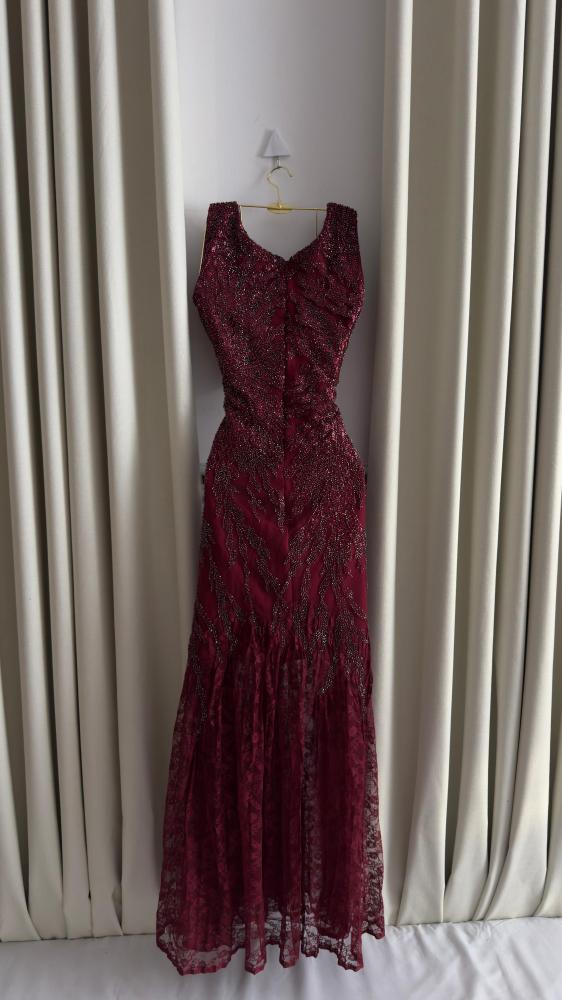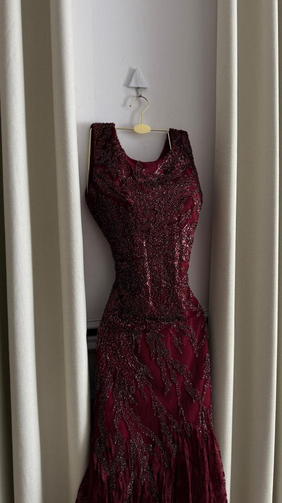 فستان سهرة فخم بلون عودي داكن بلمسات سوداء لامعة يعكس مزيجًا راقيًا من الجرأة والأناقة.