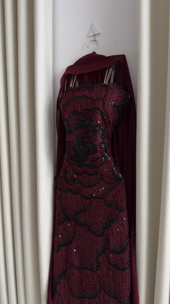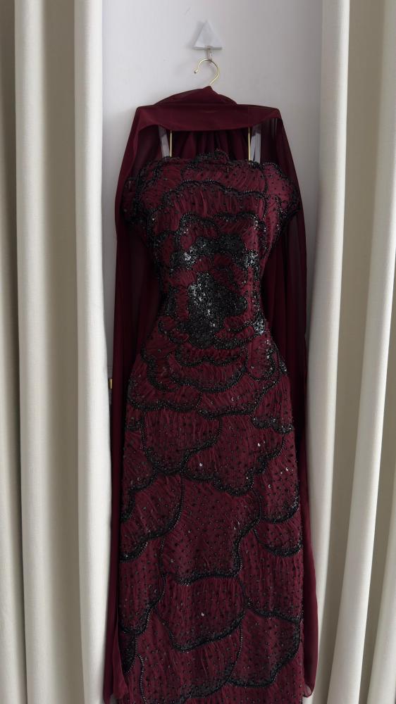 مصنوع من قماش دانتيل مطرز بالكامل بالترتر والخرز الأسود بتصميم فني على شكل ورود كبيرة متداخلة تضفي لمعة راقية تحت الإضاءة.