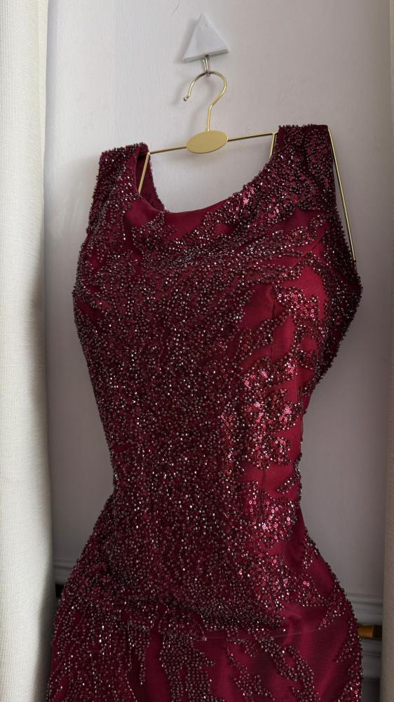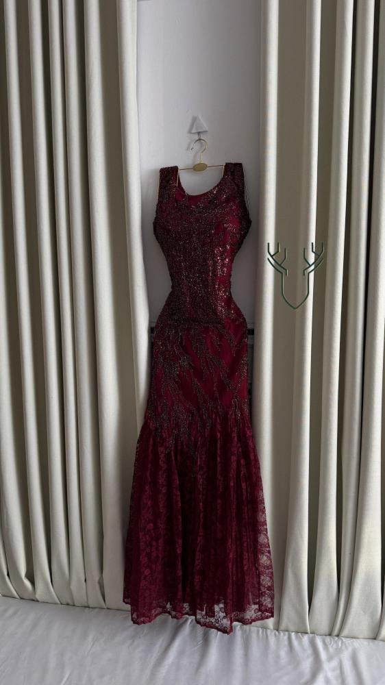 يأتي الفستان بقصة ضيّقة تُبرز جمال القوام، مع لمسات خفيفة عند الخصر تمنح توازناً وأناقة أنثوية.