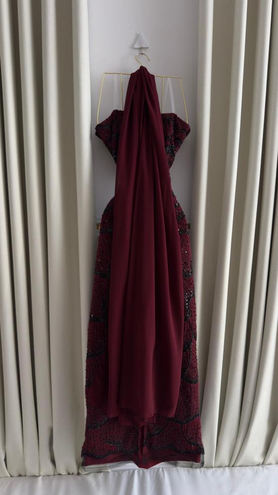 ويرافقه شال من قماش الشيفون الناعم بنفس لون الفستان ليمنح الإطلالة لمسة فخمة وناعمة في الوقت نفسه — يمكن ارتداؤه على الكتفين أو تركه منسدلًا بخفة خلف الظهر.