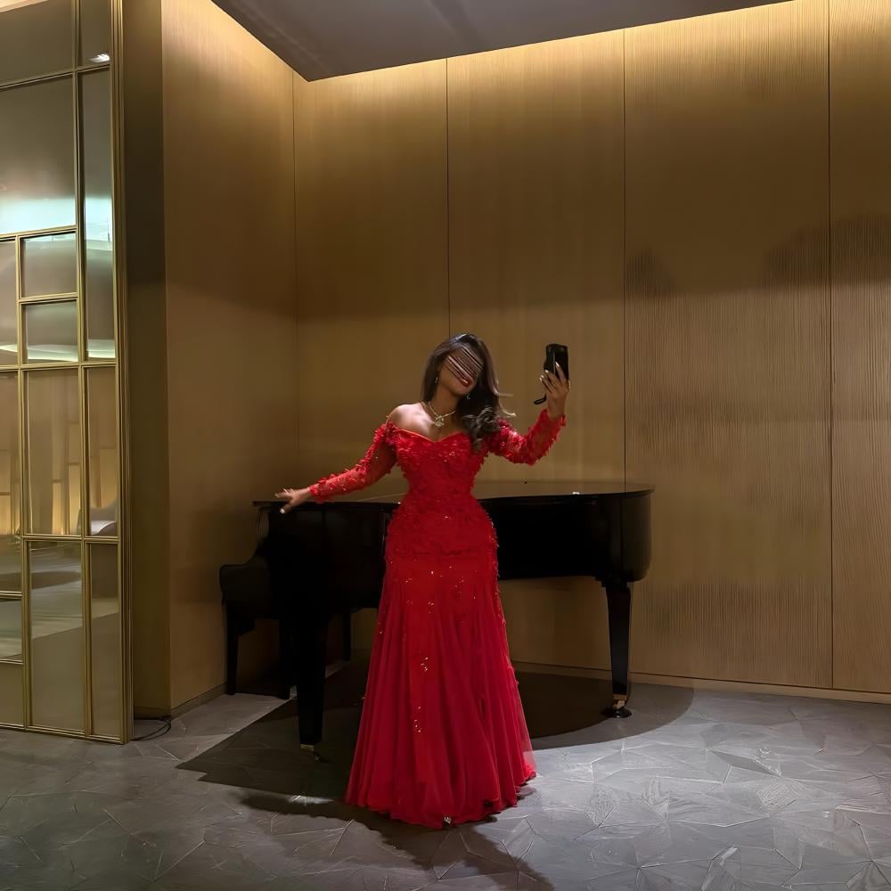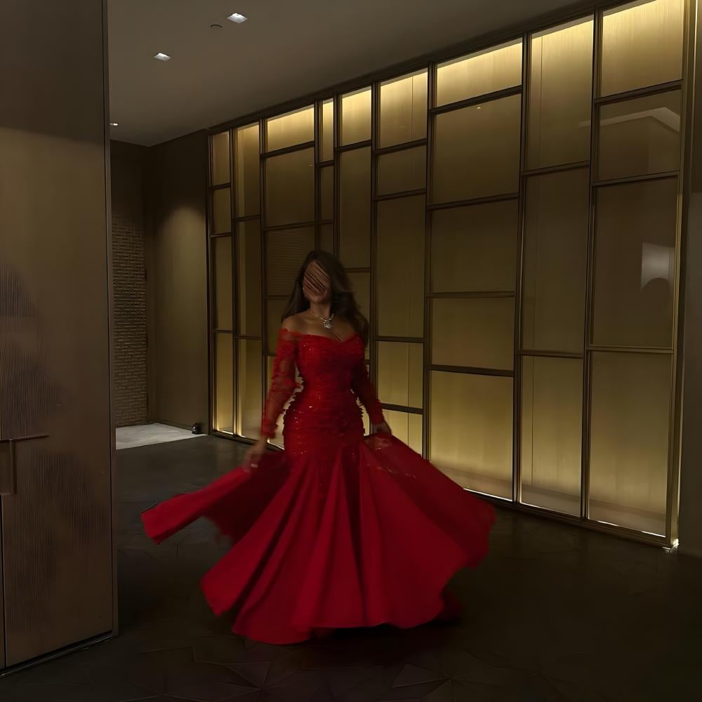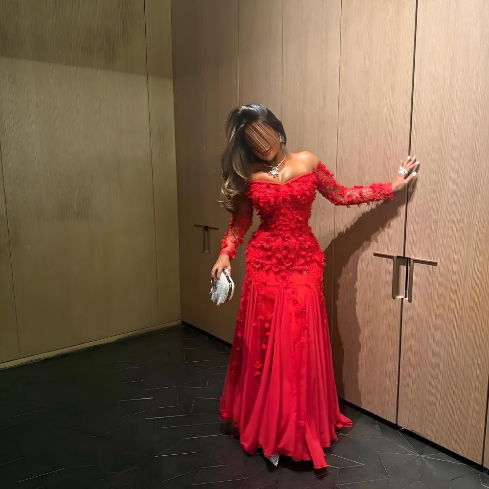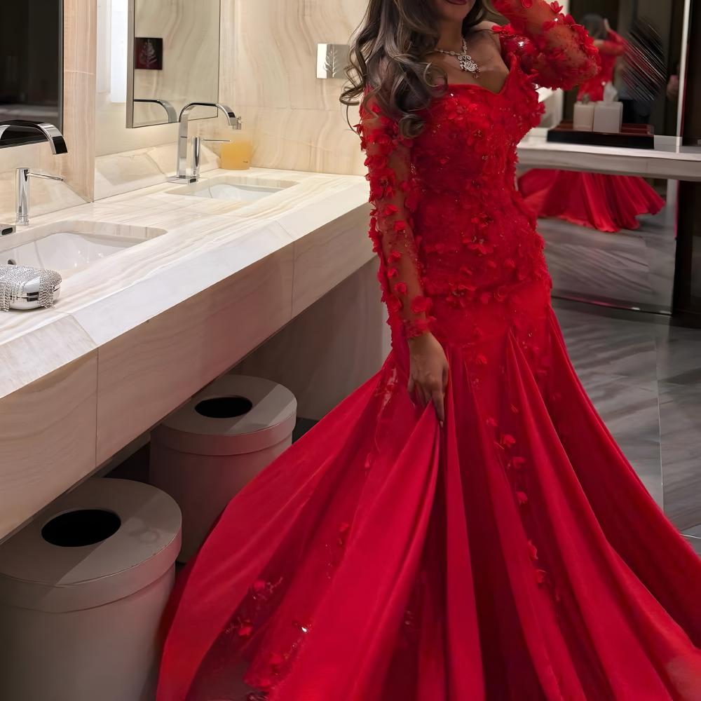 فستان سهرة فاخر باللون الأحمر الجذاب، يتميز بتصميم أنثوي راقٍ يجمع بين الفخامة والرقة. الجزء العلوي مصنوع من طبقة ورود بارزة مطرزة بعناية تضيف لمسة ثلاثية الأبعاد مبهرة، مع أكمام طويلة شفافة من الشيفون المطرز بنفس التفاصيل الدقيقة. القصة ضيقة عند الخصر لإبراز القوام الأنثوي، وتتسع بنعومة في الأسفل مع خامة الشيفون الفاخر المنسدل بانسيابية أنيقة تمنح الفستان حركة ساحرة عند المشي.