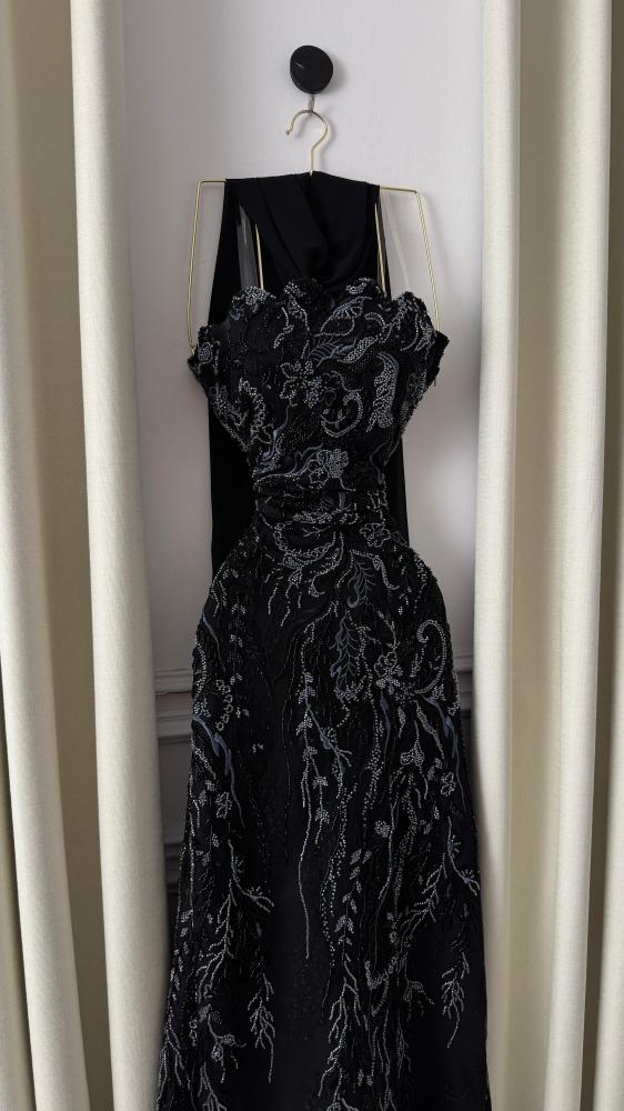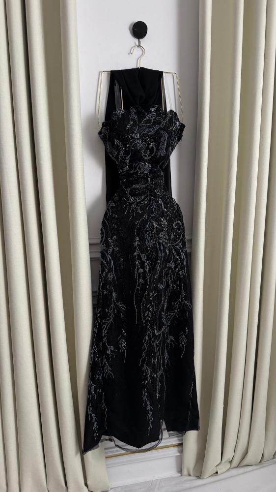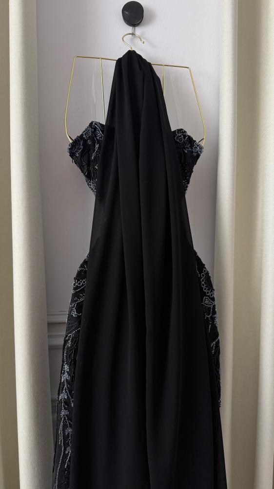 فستان سهرة أسود مطرز بكلفة فاخرة وشال منفصل