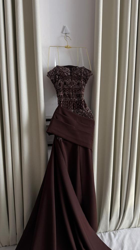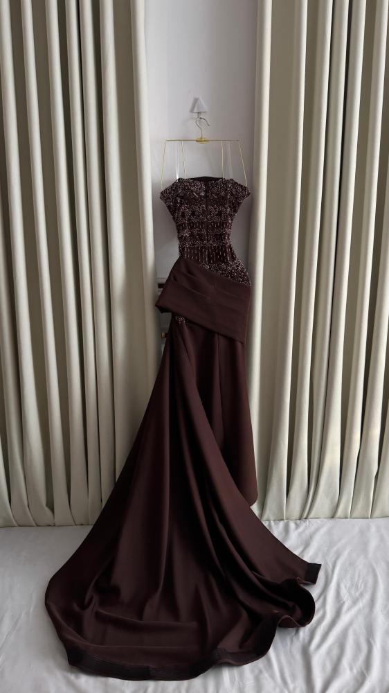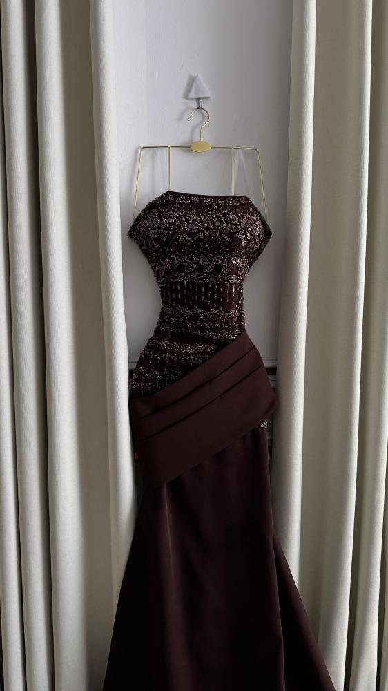 فستان سهرة أنيق بلون بني شوكولا غنيّ بتصميم راقٍ يجمع بين الفخامة والنعومة.