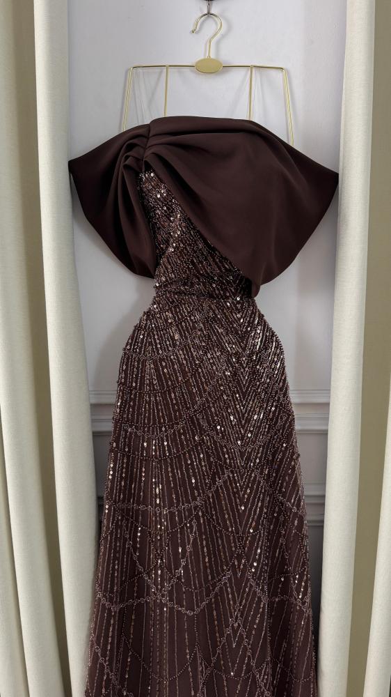فستان سهرة بني فخم بكلفة وخرز فاخر
