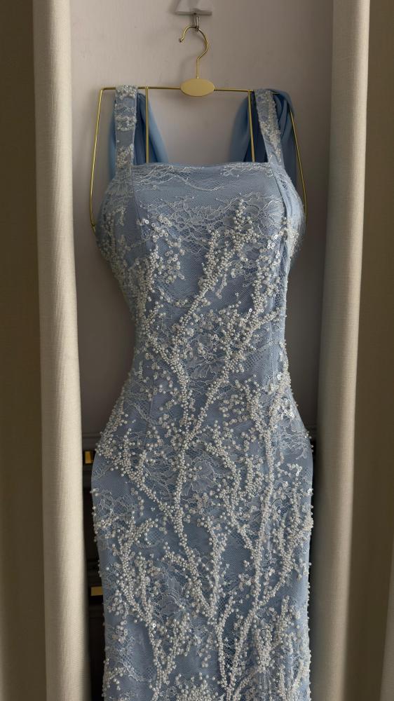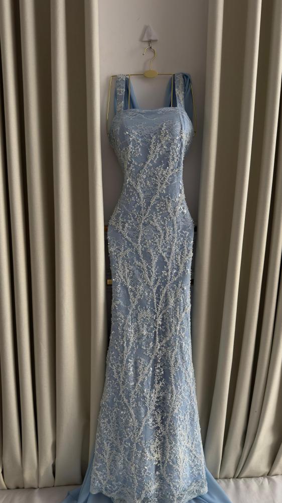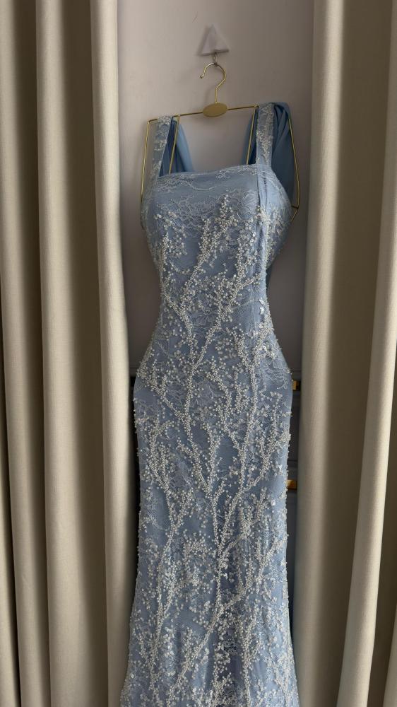 فستان سهرة أنيق من قماش الدانتيل الفاخر بلون سماوي ناعم، مطرز بدقة فائقة بالخرز واللؤلؤ الأبيض الصغير الذي يتوزع بشكل انسيابي يشبه أغصان الزهور على كامل الفستان.