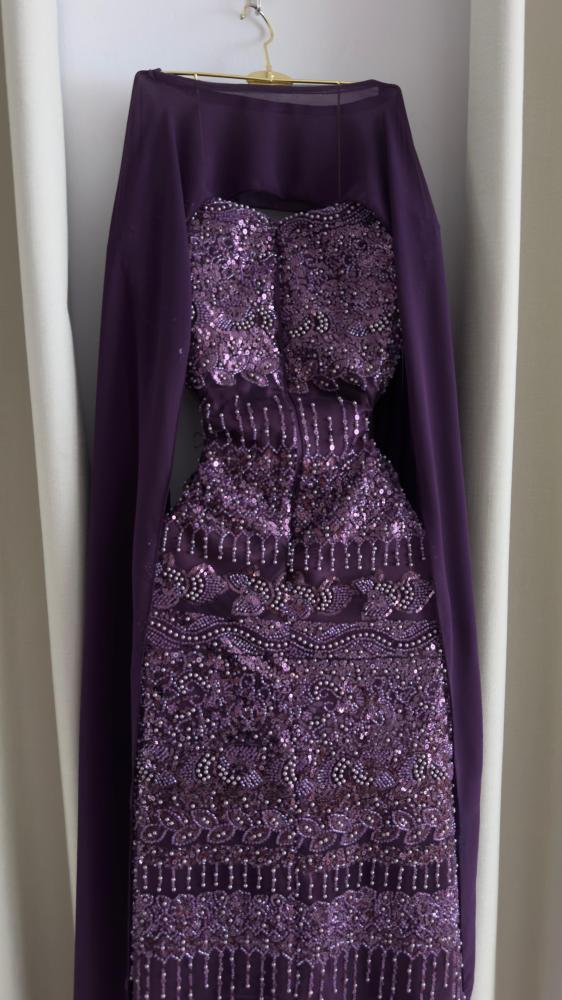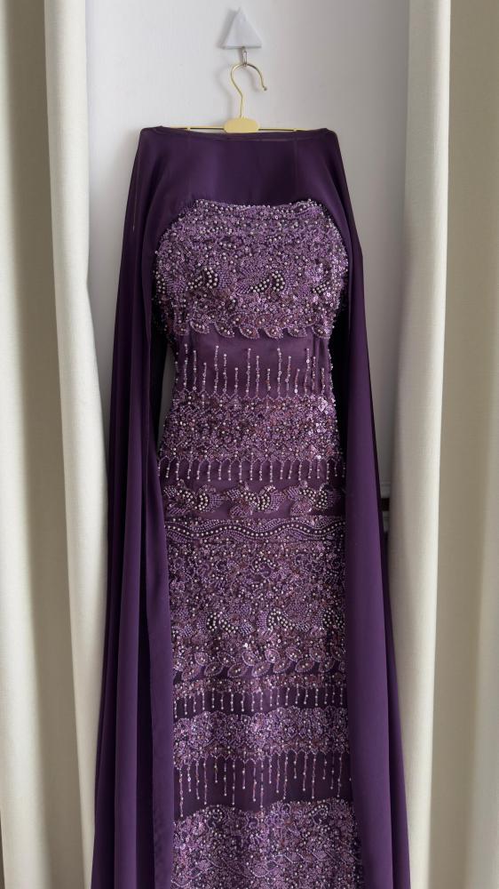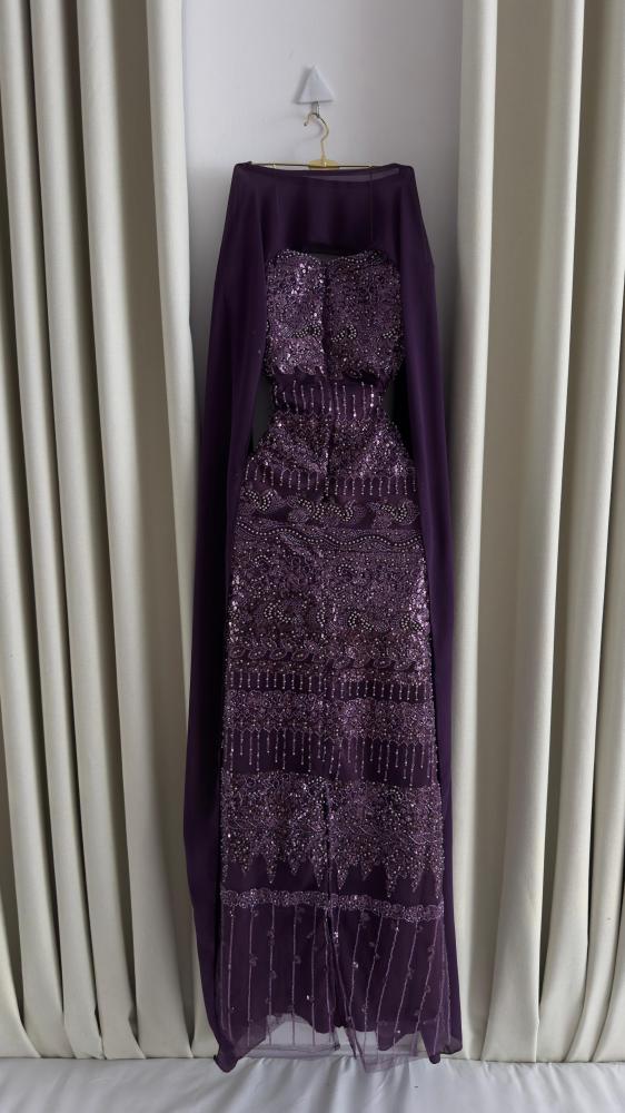 • الخامة: كلفة سهرة مطرزة يدويًا بخيوط حريرية، خرز لؤلؤي صغير، وترتر بنفسجي لامع بتفاصيل هندسية متقنة.