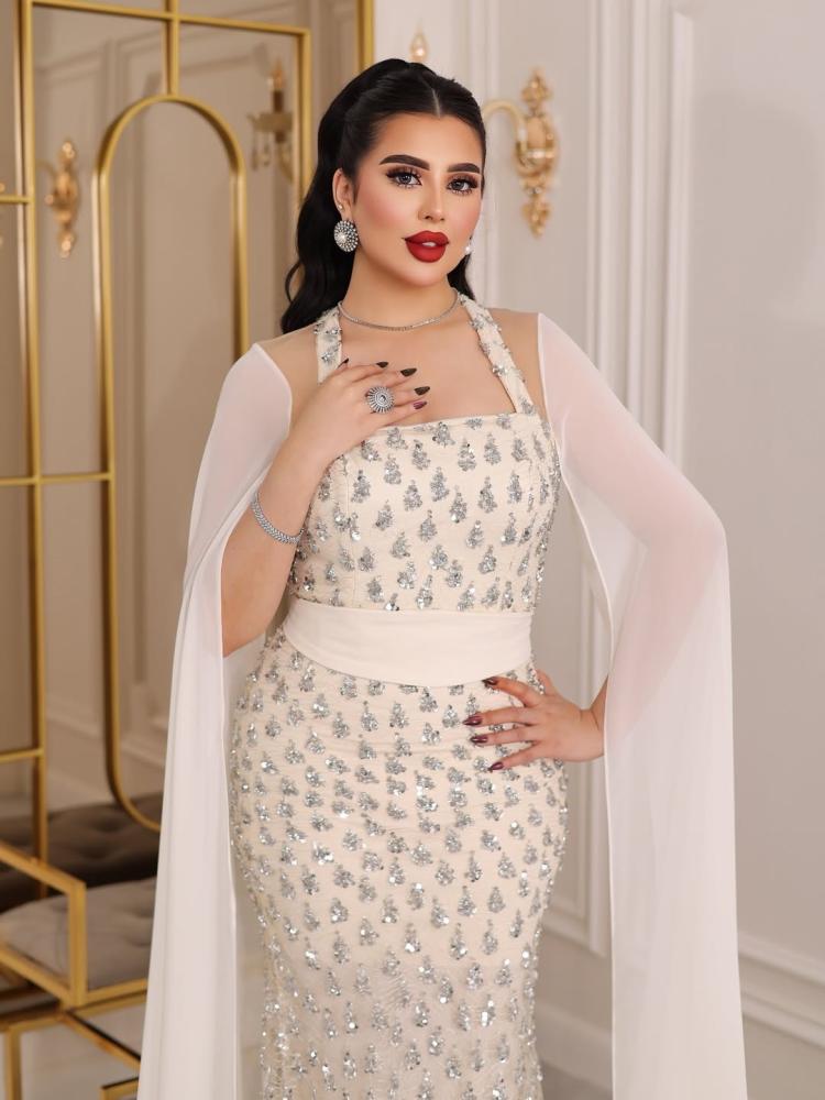 • التصميم: أوف شولدر، قصّة ضيقة، شق جانبي، لمعة راقية