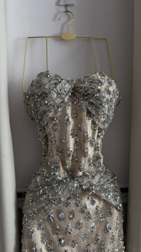 فستان سهرة فخم باللون بيج فاتح مزين بالكامل بتطريز فضي لامع يمنح إطلالة فاخرة ومتألقة.