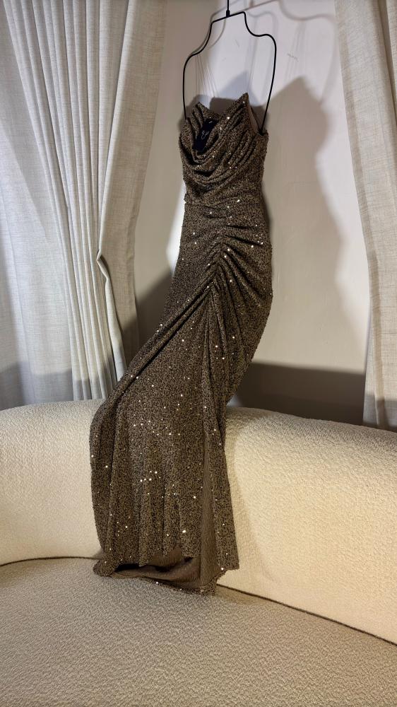 ✨ تألقي بإطلالة ملكية مع هذا الفستان الطويل الذهبي المطرز بالترتر اللامع.
