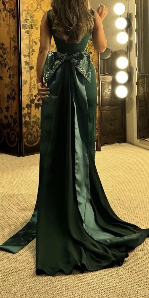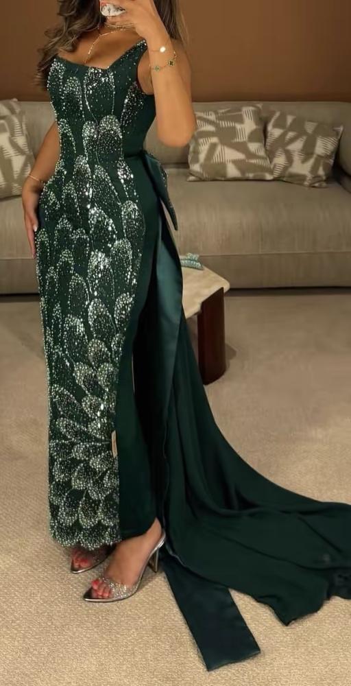 فستان سهرة فاخر باللون الأخضر الملكي، مطرّز بالكامل بترتر لامع متدرج يشبه أوراق الشجر الراقية ليمنح إطلالة فخمة وساحرة.