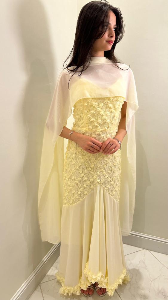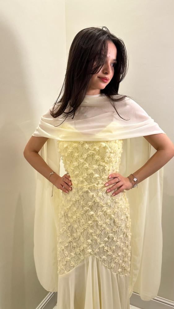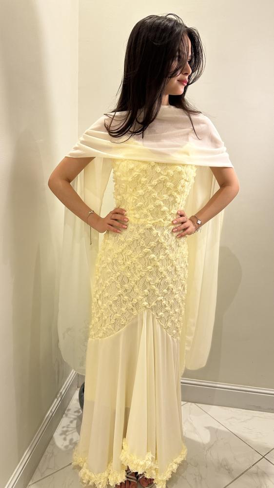 فستان ليموني يحمل عبير الفخامة والأنوثة، يليق بالمناسبات الفاخرة والاحتفالات الراقية.