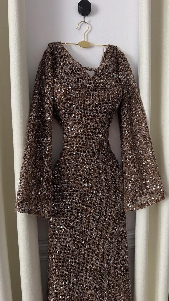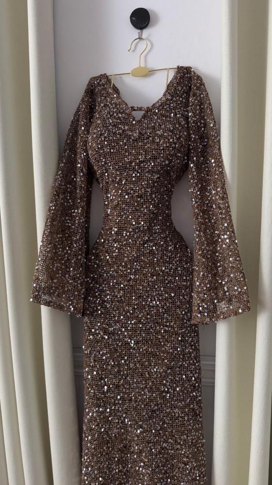 فستان سهرة ترتر شبكي بقَصّة ضيقة وأكمام واسعة