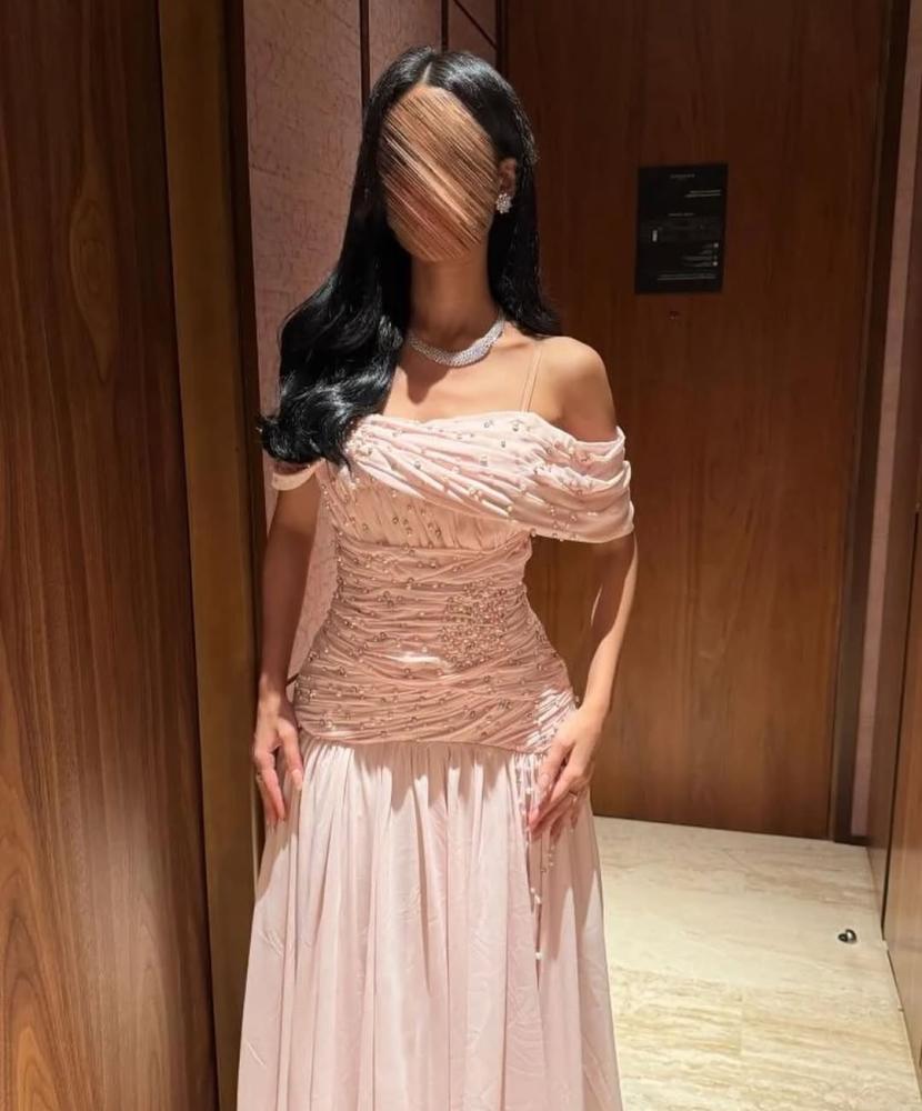 تألقي بإطلالة أميرية مع هذا الفستان اللحمي الراقي المصنوع من شيفون ناعم فاخر، يتميز بتطريز دقيق من لؤلؤ كبس وكريستال متناثر على كامل الصدر والخصر بطريقة فنية تضيف لمعانًا جذابًا.