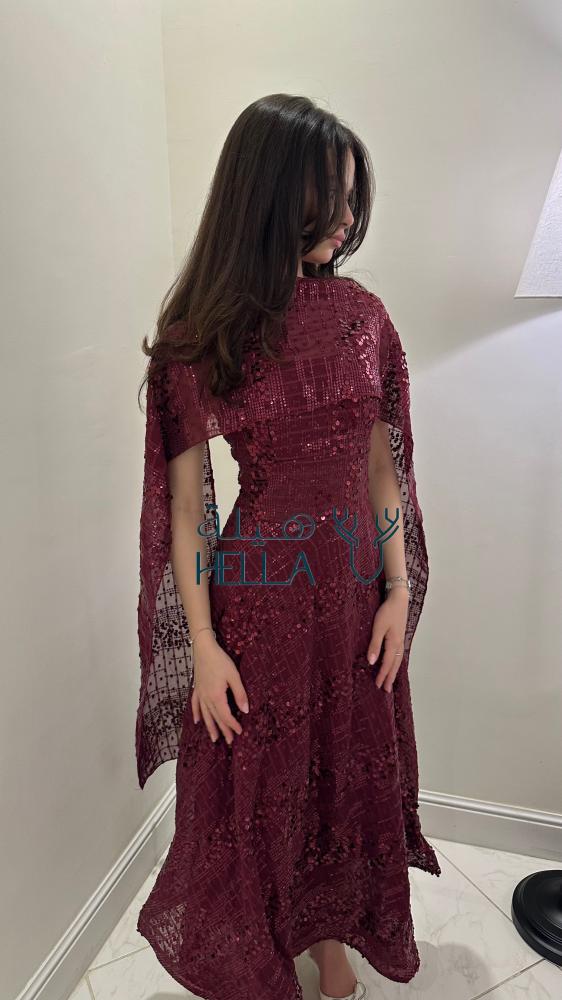 فستان أنيق بتصميم راقٍ من قماش كلفة مطرزة بالترتر اللامع بتفاصيل هندسية دقيقة تمنحه إطلالة ليلية فاخرة.